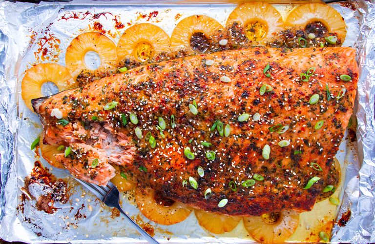 Spice up your life salmon. INGREDIENTS   1 tsp. extra-virgin olive oil, plus more for drizzling 2 cloves garlic, minced 1/2 c. diced onion 1 1/2″ piece